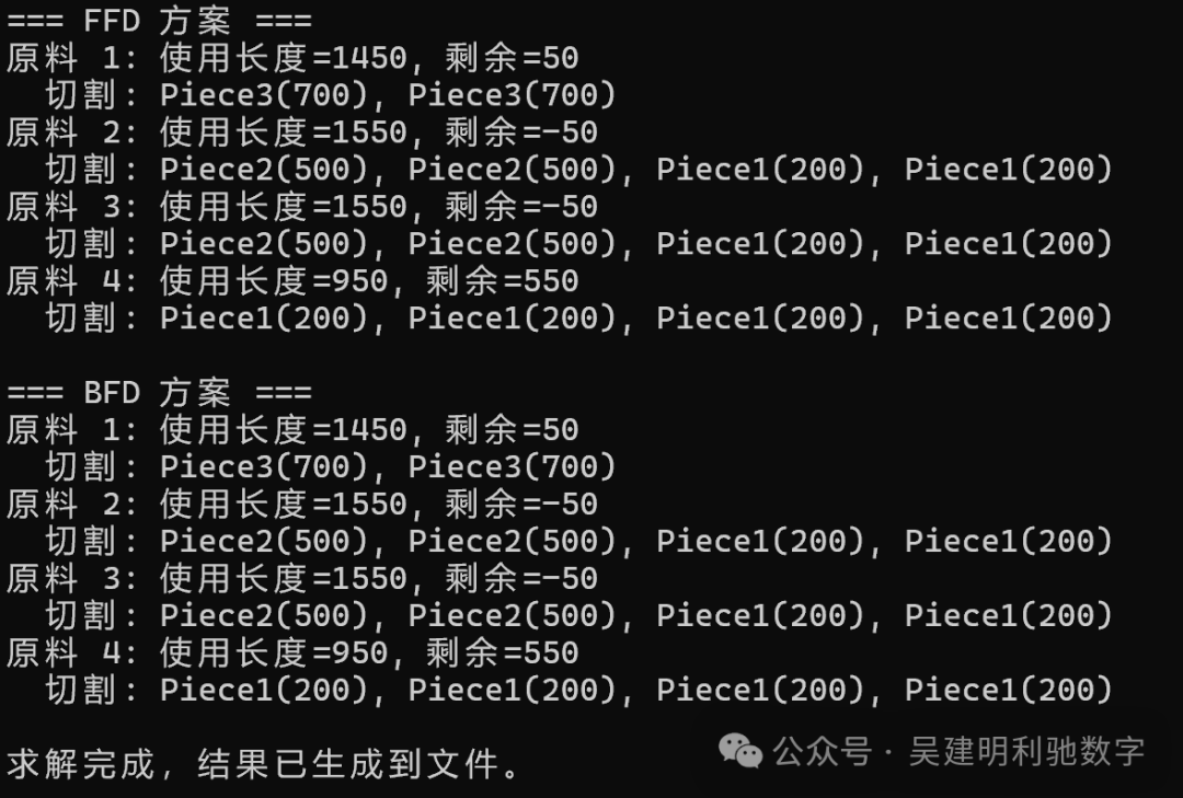 Console.WriteLine("FFD 和 BFD 求解完成,输出已生成。");
