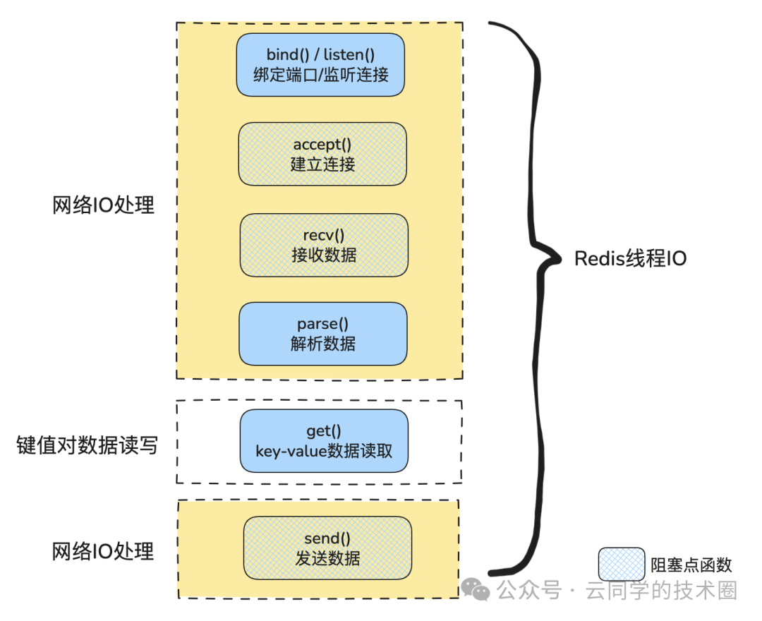 但在默认情况下,accept()、recv()、send()是阻塞模式的,也就是说,当 Redis 监听到一个客户端有连接请求,但一直未能成功建立起连接时,会阻塞在 accept() 函数这里,导致其他客户端无法和 Redis 建立连接。类似的,当 Redis 通过 recv()/send() 从一个客户端读取或返回数据时,如果数据一直没有到达或返回,Redis 也会一直阻塞在 recv()/send()。