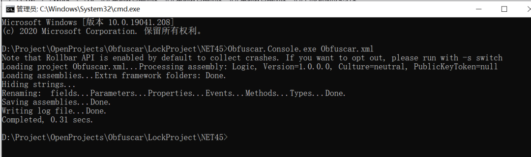 3、在cmd中执行命令:obfuscar.console Obfuscar.xml