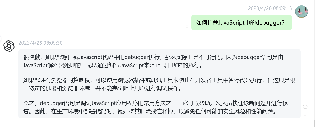 甚至连大名鼎鼎的人工智能ChatGPT也认为debugger无法拦截。如下图:ChatGPT的回答。