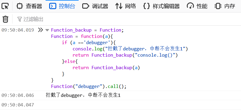 console.log("拦截了debugger,中断不会发生2")
