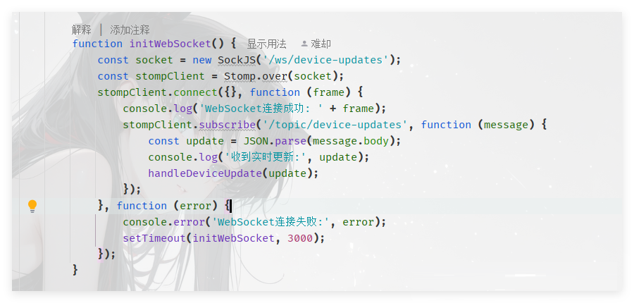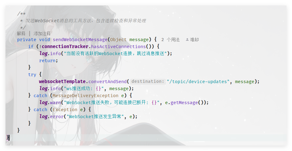 1.pom引入spring-boot-starter-websocket<dependency> <groupId>org.springframework.boot</groupId> <artifactId>spring-boot-starter-websocket</artifactId></dependency>2.注入SimpMessagingTemplateprivate final SimpMessagingTemplate websocketTemplate;3.发送消息websocketTemplate.convertAndSend("/topic/device-updates", message);