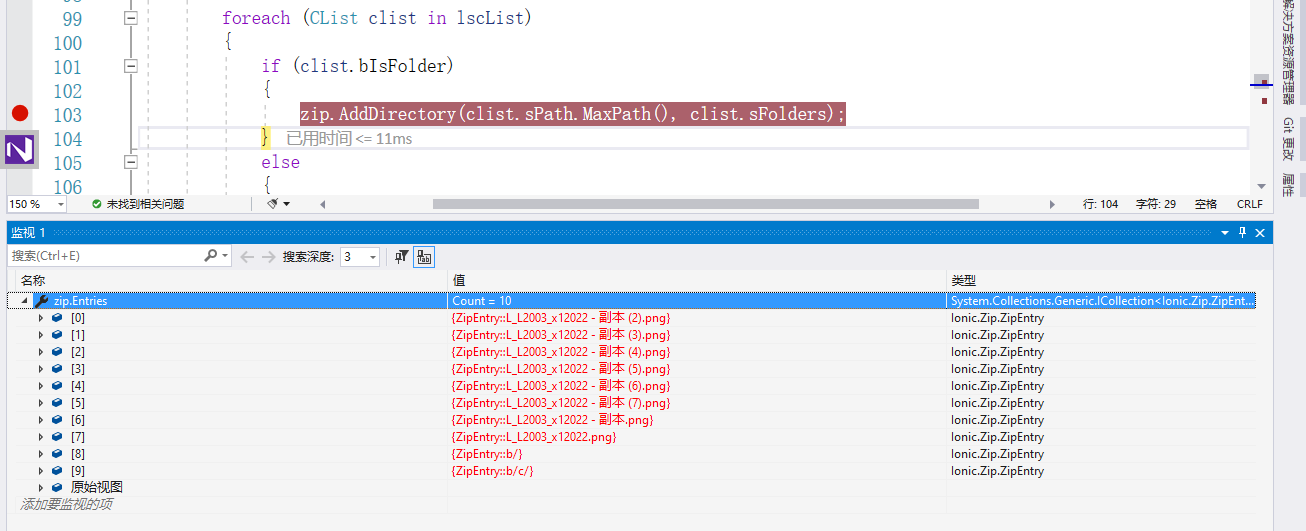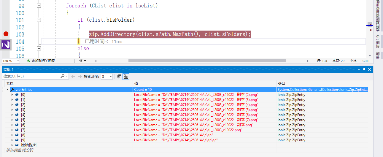 我们可以看到,在添加前,ZipFile.Entries是空的。