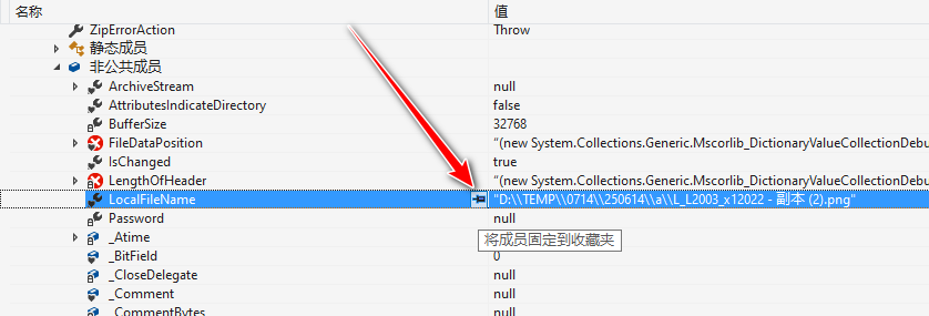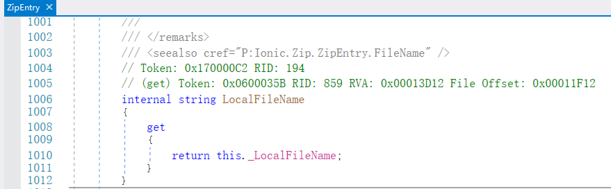 这里常用的工具是dnSpy,我们使用dnSpy打开DotNetZip,然后定位到ZipEntry,再找到LocalFileName属性: