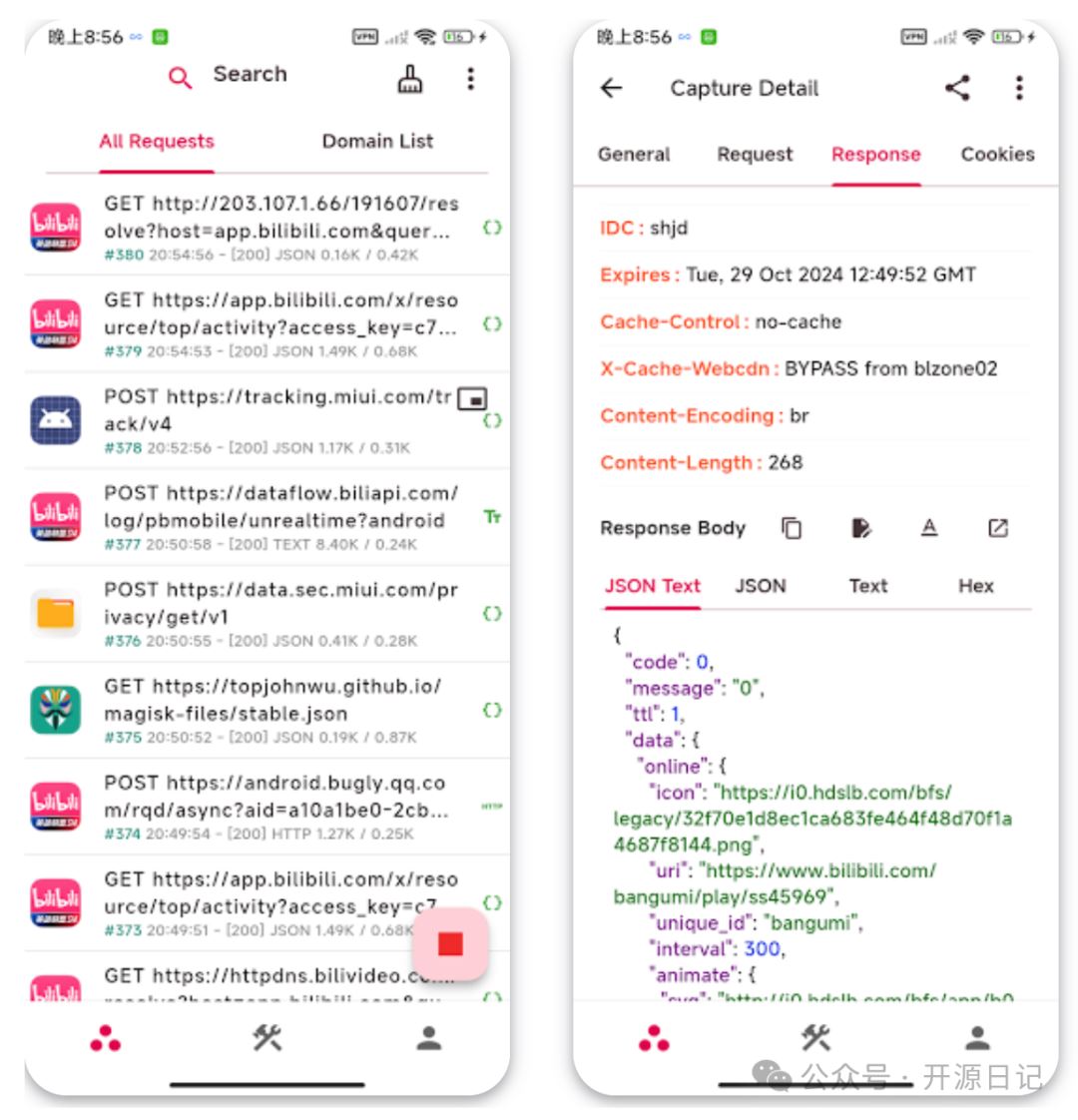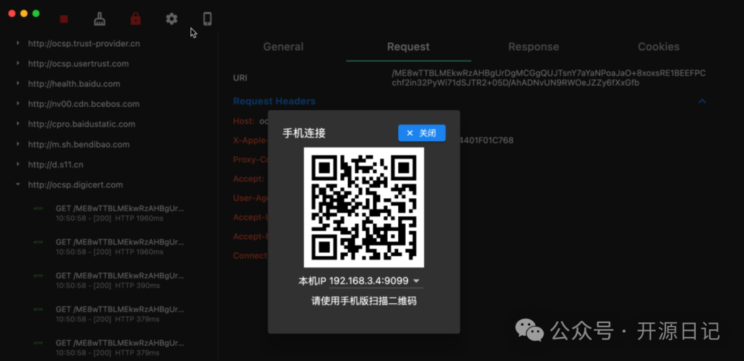 - 流量拦截与实时查看: 支持拦截 HTTP 和 HTTPS 的网络请求,包括 URL、Header、Body 等重要信息一览无余。
