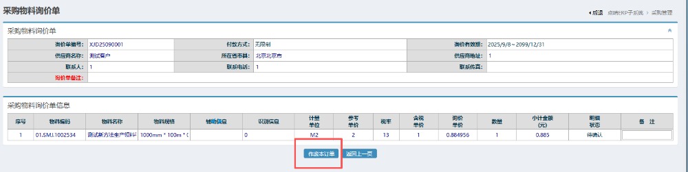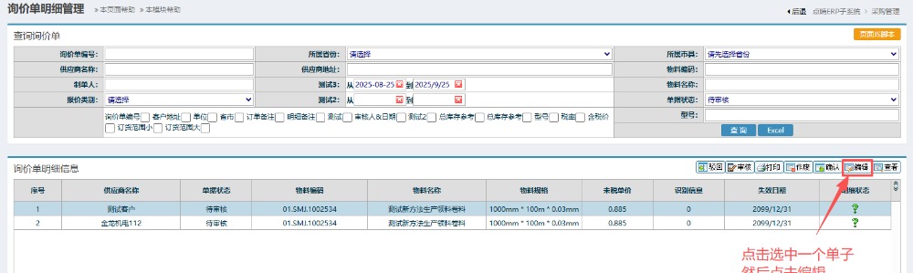 1. 进入ERP系统之后,在左侧的功能菜单里找到“采购管理”,点开“询价单管理”,点击“询价单明细管理”。