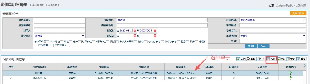 4.同样,如果需要作废询价单的话,也是在再次点击“询价单明细管理”回到界面内。选中单子点击作废
