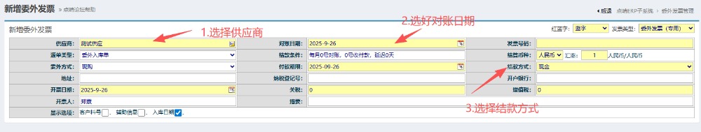 2.进入界面后,按图操作:先选择供应商,填好对账日期以及选好结款方式
