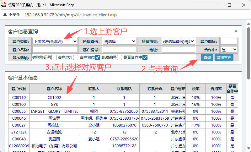 点击供应商后会弹出客户信息窗口界面,按图操作:选上游客户,点击查询。然后点击选择对应的客户
