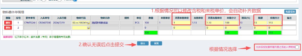 4.选好对应发票明细后,可以根据情况修改含税和未税的单价,确认无误后点击提交