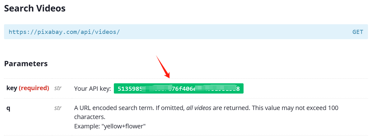 Pixabay API Key,个人使用,也是免费的。链接地址:https://pixabay.com/api/docs/#api_search_videos