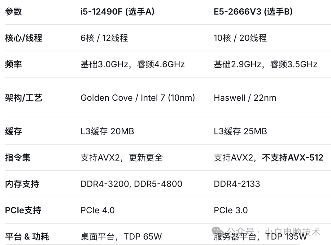 很多朋友在选配电脑时,总会盯着一个参数——CPU。而关于CPU,最让人困惑的问题之一就是:“这个CPU有多少个线程?是不是线程越多就越牛?” 今天,小白就来讲讲这个问题。为了让大家有最直观的感受,我们会请出两位风格迥异的“选手”:酷睿i5-12490F和至强E5-2666v3。看完它们的对决,你自然会找到答案。 酷睿i5-12490F 至强E5-2666v3 正文开始 如何看CPU参数? 在对比之前,我们得先知道参数中:核心、线程、频率、指令集、制作工艺、缓存、架构这些到底是什么意思。 核心-真正的厨师 可以把CPU想象成一个厨房,核心就是厨房里的厨师。一个核心就是一位厨师。理论上,厨师越多,能同时炒的菜就越多。 核心是物理存在的,是执行计算任务的真正单位。核心数量直接决定了CPU的多任务处理能力。 线程-厨师能同时做的事情数量 一位优秀的厨师可以“左右开弓”,一边翻炒A锅里的菜,另一边准备B锅的调料。这种“同时”处理多个任务的能力,就是线程。英特尔称之为超线程技术,让一个物理核心能同时处理两个任务线程。 线程是一种逻辑概念。比如一个6核CPU,如果支持超线程,那它就能同时处理6核×2=12个线程。这能有效提升核心的工作效率,尤其是在多任务环境下。 还有大小核的不同,有些小伙伴会发现有些CPU是16核24线程,说明其中有8个大核8个小核。 频率-厨师的手速 厨师炒菜的速度有多快?频率(单位GHz)就是厨师的“手速”。手速越快,单个菜炒好的时间就越短。频率越高,CPU每个核心执行单个任务的速度就越快。它很大程度上决定了单核心的性能强弱。 指令集-厨师的菜谱 厨师需要按照菜谱来做菜。指令集就是CPU的“菜谱”,它规定了CPU能执行哪些基本操作。新一代的菜谱(如x86, SSE, AVX2, AVX-512)会包含更高效、更强大的“烹饪技巧”。 越新、越先进的指令集,能让CPU用更少的步骤完成更复杂的计算,尤其在科学计算、视频编码、AI应用中效果显著。 制作工艺-厨房的精密程度 早期的厨房设备笨重、占地大、还费电。现在的厨房设备小巧、精密、效率高。制作工艺(如14nm, 7nm, Intel 7)就代表了制造CPU的精度,单位是纳米(nm),数字越小,工艺越先进。 更先进的工艺意味着:在同样大小的芯片里,能塞进更多的晶体管(更多/更强的厨师)。功耗和发热更低(更省电,制冷压力小)。能运行在更高的频率(手速可以更快)。 缓存-厨师的备菜台 厨师手边有一个备菜台,上面放着最常用到的食材和调料,不用每次都跑去遥远的仓库(内存)取,大大提高了效率。这个备菜台就是缓存。 缓存是CPU内部的高速存储器,分为L1/L2/L3三级。容量越大、速度越快,CPU“等”数据的时间就越少,性能发挥就越充分。 架构-厨房的整体设计 两个厨房,厨师数量和手速都一样,但一个厨房布局合理,动线流畅;另一个乱七八糟,厨师经常互相挡路。显然,前者的出菜效率更高。这个“整体设计”就是架构。 架构是CPU的蓝图,决定了各个部件如何协同工作。架构的革新是性能提升最关键的一环。新一代架构通常意味着更高的执行效率和更强的性能。 i5-12490F 对比 E5-2666v3 结果分析:线程多,真的赢了吗?E5-2666v3拥有10核20线程,线程数远超i5-12490F的6核12线程。在实际应用中,情况却不一定了。 游戏性能 绝大多数游戏对高频率和新架构的依赖度远高于核心数量。i5-12490F凭借其高达4.6GHz的睿频和先进的Golden Cove架构,在游戏中的帧数表现会远远甩开E5-2666v3。E5的单个核心“太慢”,拖了后腿。 日常应用与生产力 像Photoshop、Office办公、网页浏览等应用,对单核性能非常敏感,i5-12490F响应更快,体验更流畅。 即使在视频剪辑、3D渲染等多线程优化好的工作中,i5-12490F的架构和指令集较新,且单个核心的效率极高,6核的性能往往不输甚至超过E5那10个老旧的核心。再加上对高速DDR5内存和PCIe 4.0 SSD的支持,文件加载和导出速度会更快。 E5-2666v3的优势在哪?如果一个大任务能拆分成数十个甚至上百个并行小任务,比如虚拟化运行大量轻量级虚拟机、搭建数据库服务器、或某些特定的科学计算。在这些场景下,E5-2666v3才能被充分利用。 --End-- CPU线程并非越多越好,咱们在组装电脑的时候需要考虑核心性能与线程数量。 对于绝大多数普通用户和游戏玩家,咱们应该更关注CPU的架构、频率和单核性能。像i5-12490F这样的新时代CPU,即使线程数不占优,但凭借架构和工艺的“代差”,其综合体验和性能可以轻松碾压老款的高线程数服务器CPU。 什么时候才需要考虑多线程CPU? 主要工作是高度并行化的专业生产力任务时,例如: