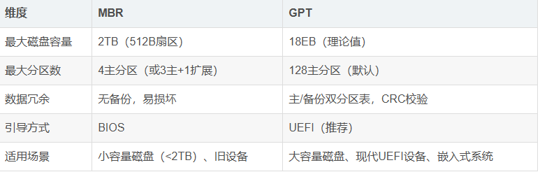 GPT(GUID Partition Table,全局唯一标识分区表)和 MBR(Master Boot Record,主引导记录)是两种主流的磁盘分区方案。