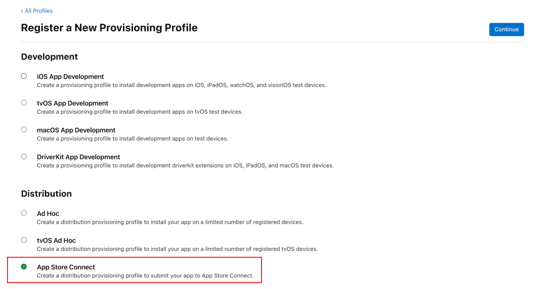 在用途中,选择App Store Connect用来进行分发。