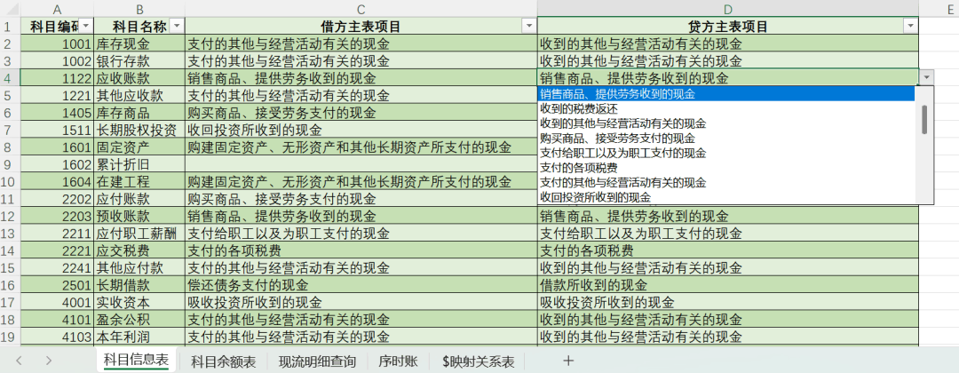 3.填充现流明细表的项目 点击“填充现流明细”,根据<科目现流信息表>的数据,自动填充现流明细表的主表项目(I列数据)。如果某条明细对应的主表项目不符合实际情况,也可下拉选择。