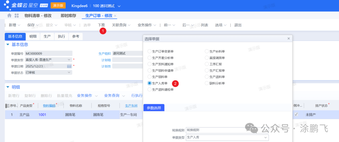 由于我们此次生产采用的是倒冲领料,我们就不用进行生产发料操作了,如下图所示,我们直接下推生产入库单,看看什么情况。