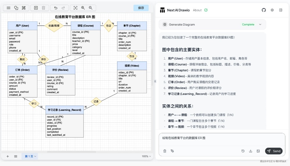 最后多说两句,这个项目的实现其实并不复杂。作者通过集成 Vercel AI SDK 轻松对接各种大模型,让 AI 生成 draw.io 能理解的 XML 代码。 然后直接使用开源的 draw.io 代码实现了核心的绘图展示和编辑能力,整个过程和 AI 生成网站是类似的。