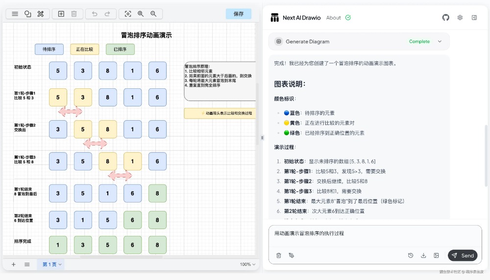 这个项目支持在线体验,你可以完全从 0 开始画图,比如画一个流程图,演示 RAG 的工作原理。 ⭐️ 建议观看视频演示:bilibili.com/video/BV18N… AI 会自动生成 Draw.io 绘图代码,很快精美的流程图就搞定了!