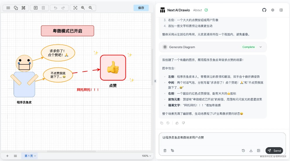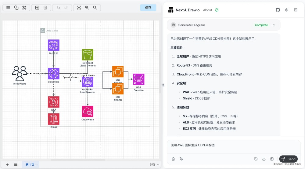 还有程序员工作涉及的架构图: 提示词:绘制电商平台的微服务架构图 UML 类图: 提示词:用 UML 类图展示用户管理模块的设计 ER 图: 提示词:绘制在线教育平台的数据库 ER 图 时序图: 提示词:用时序图展示用户登录的交互过程 知识讲解图: 提示词:用动画演示冒泡排序的执行过程 甚至是沙雕图: 提示词:让程序员鱼皮卑微地求用户点赞 这些通通不在话下,帮你节省大把的时间!! 还有一些使用小技巧,比如配合免费的图标库,让整个绘图元素更丰富。 提示词:使用 AWS 图标生成 CDN 架构图