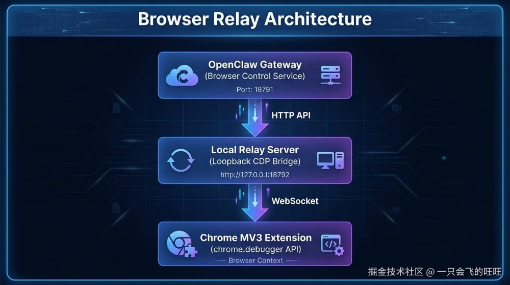 Extension Relay 的核心价值在于:你可以让 AI 操作你已经登录的网页、正在浏览的内容,而不需要重新在隔离环境中登录。 架构解析Browser Relay 由三个核心组件构成: