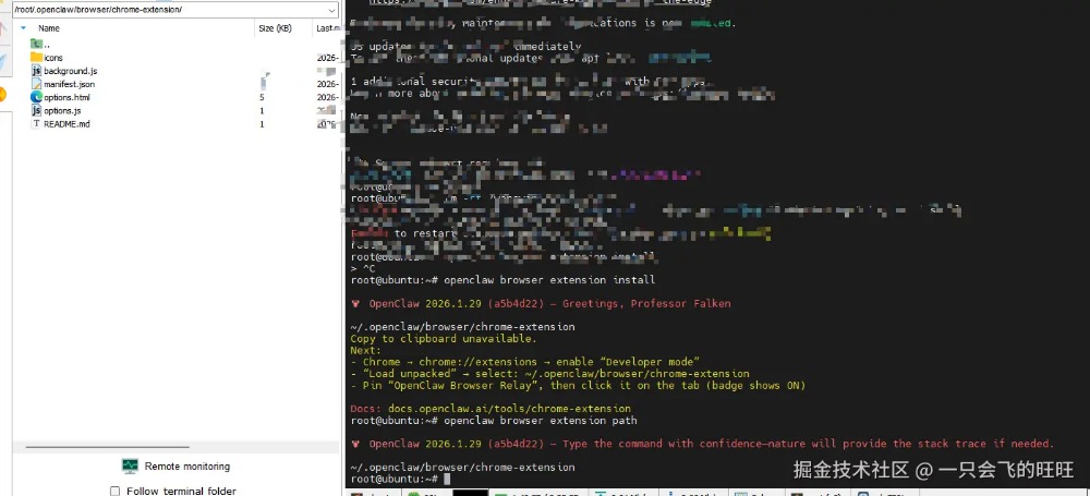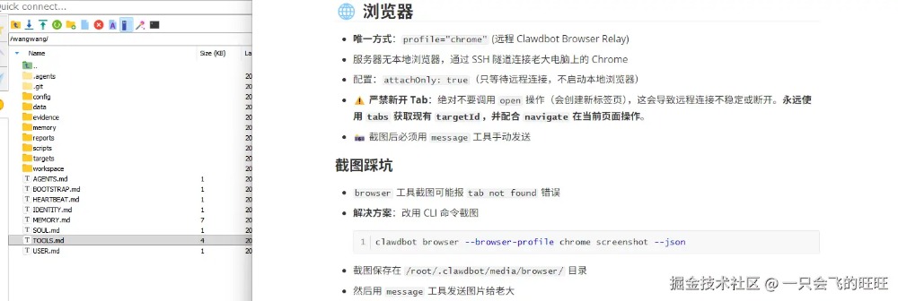 这两天看公众号都是安装教程,也没看到其他使用上的问题, 我来分享一下我的一些使用经验吧! 这几天晚上经常用OpenClaw 帮我操作点东西,结果发现浏览器又连不上了。重启 Gateway 后,我又得打开 Chrome,手动点击那个 Browser Relay 插件的图标, 这大冬天的,谁愿意起来碰电脑啊, 这让我苦恼不已! 简单介绍OpenClaw(前身为 Clawdbot/Moltbot)是一款强大的 AI 助手框架,其浏览器自动化功能让 AI 能够"看见"并"操作"网页。 本文将深入介绍 OpenClaw 的远程浏览器功能——特别是 Chrome Extension Relay 模式,以及我在使用过程中遇到的问题和解决方案。至于为嘛不用内置的浏览器功能,因为启动一个chrome我的小服务器就快顶不住了! 什么是 Browser Relay?OpenClaw 提供了两种浏览器控制模式: