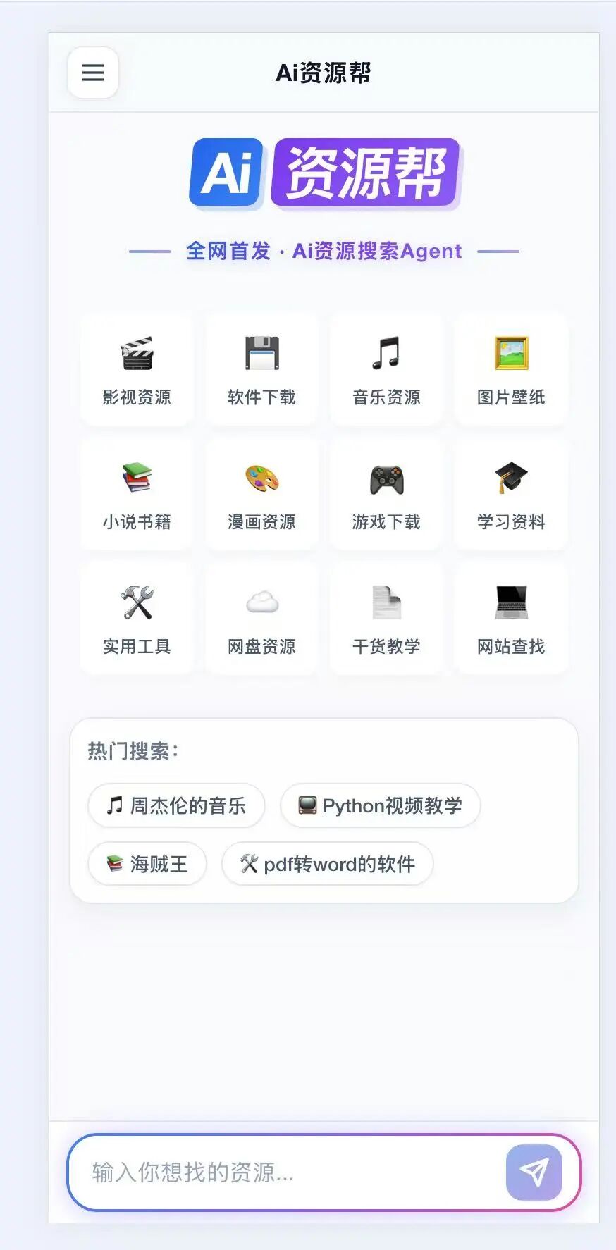 网址: https://ai-zyb.com(复制链接在浏览器打开) · Ai资源帮(网站) · Ai资源帮,是一款主打「AI 全领域资源搜索」的智能 Agent。
