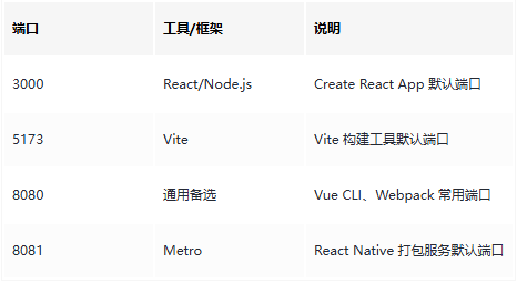 │ └── 常用端口:80(HTTP)、443(HTTPS)、3000(React)、5173(Vite)