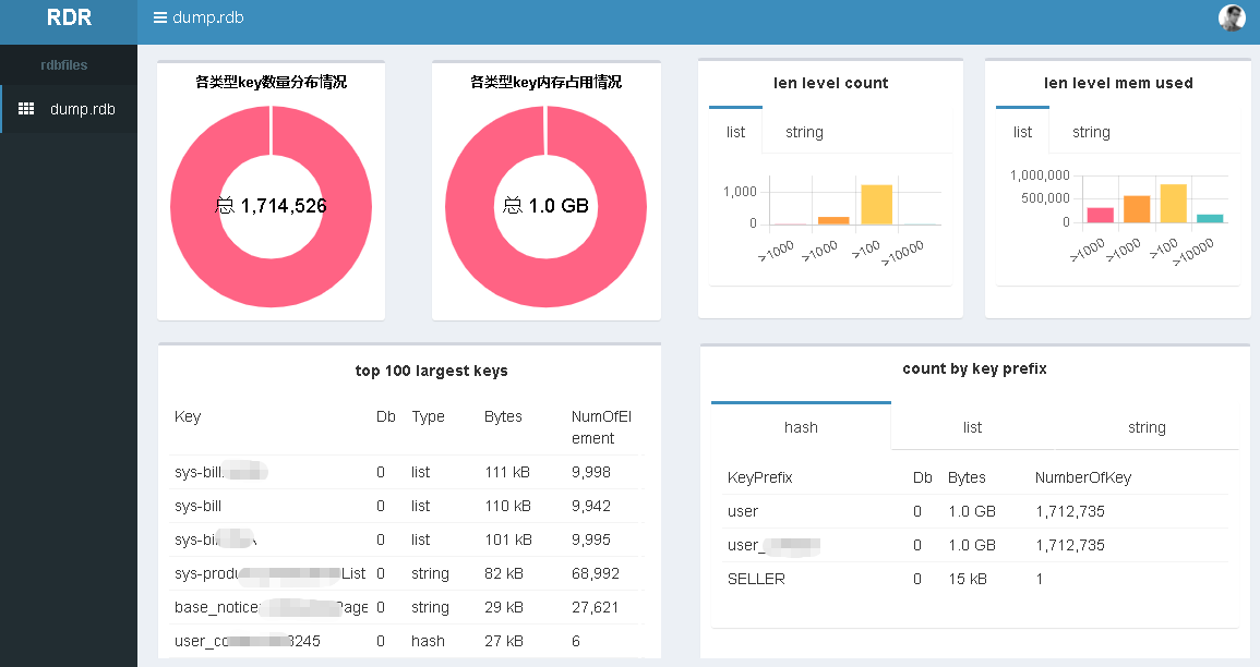 • 统计信息展示(command:show):以网页形式展示RDB文件的统计报告(例如 Top 300 大Key列表、key名前缀统计分析等)。