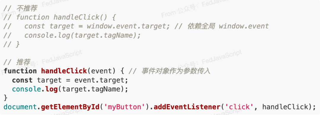 在旧的IE浏览器事件模型中,事件对象是通过全局的 window.event 访问的。现代浏览器遵循W3C标准,将事件对象作为第一个参数传递给事件处理函数。依赖全局 window.event 会导致代码在非IE旧版浏览器或严格模式下失效。