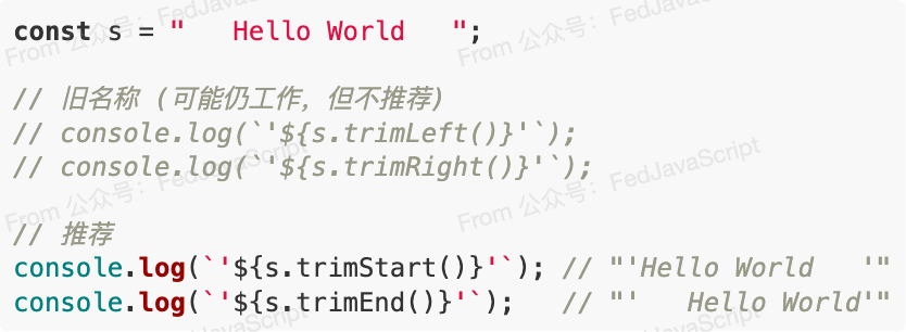 这两个方法用于移除字符串开头或结尾的空白字符。它们已被ECMAScript标准采纳,但名称更改为 trimStart() 和 trimEnd() 以获得更好的语义一致性(与 padStart() 和 padEnd() 等方法对齐)。虽然旧名称在很多浏览器中仍可作为别名使用,但推荐使用标准名称。