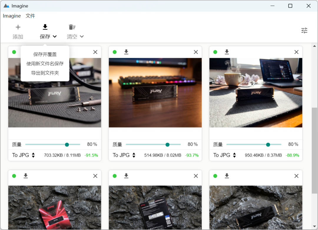 然后把想要压缩的图片批量拖进去,Imagine会自动开始压缩图片。等所有图片左上角都有绿色圆点的完成指示后,点击“保存”即可完成。