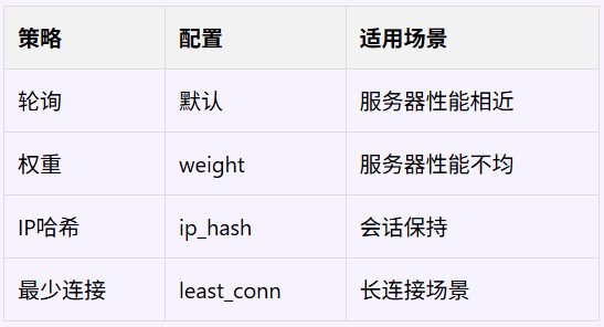 upstream backend { server 192.168.1.10:8080 weight=3; server 192.168.1.11:8080 weight=2; server 192.168.1.12:8080 backup; } server { listen 80; location /api { proxy_pass http://backend; }}