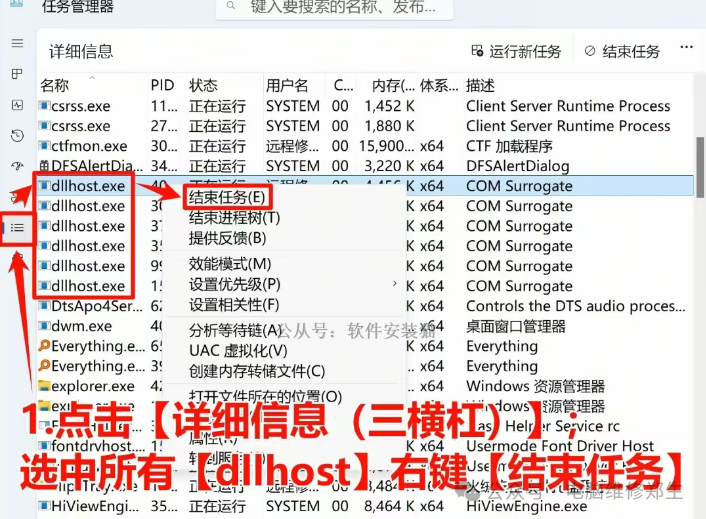 在打开的窗口中,我们点击左边的三条横杆,它就是详细信息。然后在右手边的窗口中,找到【dllhost.exe],我们再选择【结束任务】