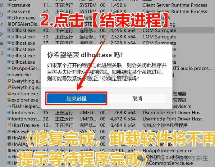 第二步,再点击【结束进程】,就可以了。接下来,你就会发现, 我们想卸载的软件可以卸载了,不会再提示【请等待当前程序完成卸载或更改解决方法】的错误提示了。你只需轻松地在卸载程序中点击几下,软件就开始自动卸载,进度条有条不紊地前进,最后成功卸载完成。