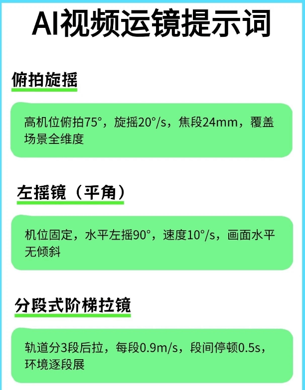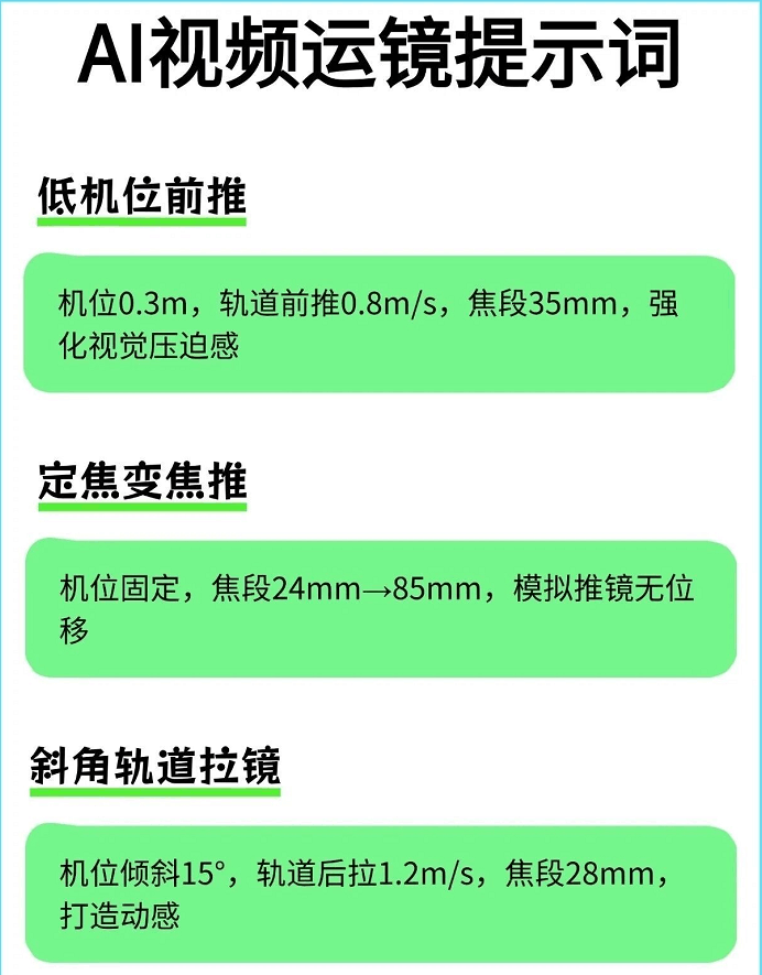 有了这个即梦4.0运镜提示词就不一样了。 它对小白特别友好,就算你完全不懂摄影,也能轻松拍出电影感✨。 不管你是用手机拍,还是用相机拍,都能用得上。像拍Vlog、人物特写啥的,它统统适配。 我试了一下,按照提示词来拍,视频的质感直接起飞了。 感觉就像是有个专业的摄影师在旁边指导我一样。 现在这种好用的提示词很难找全了,所以我强烈建议大家赶紧把这份“拍啥都像大片”的指令合集存住🔥🔥。