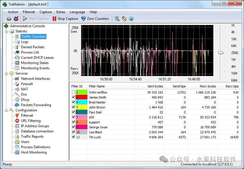 功能特色软件特色这是一套全能型网络流量监控与管理工具,主打精细化流量管控:支持无限数量的流量过滤器与自定义规则集,可针对主机、子网、IP协议(ICMP、TCP、UDP、OSPF等)抓包监控,能以彩色图表实时展示流量活动,还支持XML报告生成、流量计数器入库(Microsoft SQL Server、Microsoft Access、MySQL等),可深度分析数据包里的MAC地址、ToS字段,并支持HTTP主机标头日志与未加密数据包提取处理。 同时自带完整网络服务与安全管控能力:具备包过滤防火墙、状态检查、流量整形器、内置NAT引擎、转发DNS服务器、DHCP服务器、URL黑白名单过滤;支持用户账号权限管理、TMeter/Windows域身份验证,可按进程/用户名统计流量,支持主机监控、MAC地址追踪、Cisco Netflow Collector v.5(v.9),并能作为Windows服务在多款Windows系统(32位/64位)上稳定运行。 更新日志v18.0.875 版本这次主要做了两方面优化: 一是更新了 MAC 供应商数据库,同时修复了监控事件窗格里 MAC 供应商名称显示异常的问题。 另外还重点解决了多个底层稳定性 bug,包括修复加载 filterset 时的内存泄漏问题,以及反序列化包含字符“|”的事件出错的问题。 类似应用