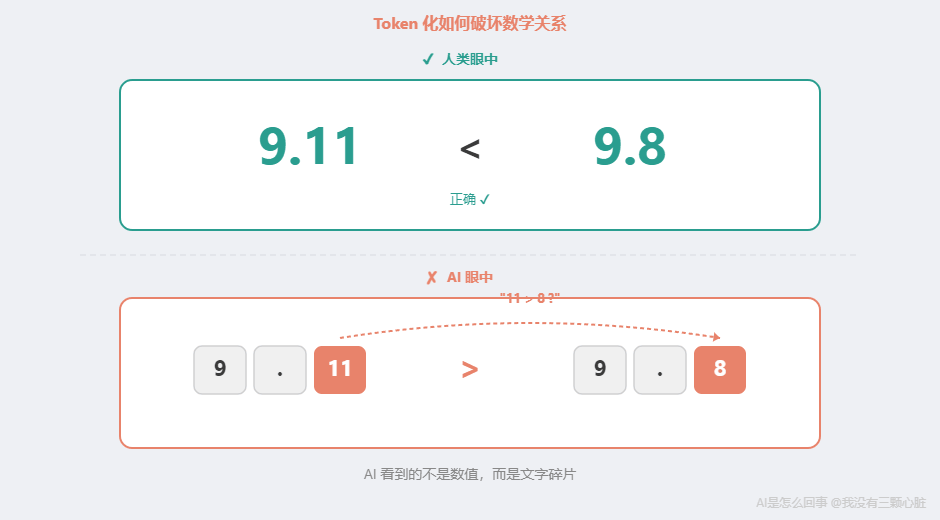 不过,这个结论也招致了争议。研究者 Alex Lawsen 指出,部分发现可能源于实验设计的限制(比如输出长度被截断)。后续论文 "Rethinking the Illusion of Thinking" 得出了更细致的结论:并非全部可以归结为实验缺陷,AI 推理确实存在认知局限——但局限的程度还在争论中。 换句话说——连研究者自己也没有达成共识。 这是 2026 年 AI 领域最大的未解之谜之一。 手术二:为什么算不对 9.11 > 9.8?这个错误看起来离谱,但用第一章的知识可以精确解释。这里面有两层原因。 第一层:它根本不是在"计算"。 当你让 ChatGPT 比较 9.11 和 9.8 的大小时,它没有一个"数学模块"在工作。它做的仍然是那一件事:预测下一个最可能的词。 它看到"9.11 和 9.8 哪个大"这段文字,然后在训练数据中寻找类似模式。简单算术("2+3=5")在训练数据中出现了无数次,模式已经被记住。但"比较两个小数"这种任务,在训练数据中的覆盖远不如考试题那么充分。 第二层:Token 化把数字的数学关系破坏了。 还记得第 2 篇讲的 Token 化吗?AI 处理文字的第一步是把文字切成小块。 Token 化可能会让数字的数学关系被破坏——数字被拆成单独的字符或片段后,AI 看到的不再是一个完整的数值,而是几个独立的文本碎片。比如"9.11"和"9.8"被拆开后,AI 可能更关注碎片之间的文字模式("11 大于 8"),而非小数本身的数学含义——于是它预测"9.11 更大"。 数字之间的数学关系(大小、相邻、倍数)在 Token 化过程中被破坏了。 在 AI 眼中,9.11 和 9.8 不是两个可以比较的数值——它们是几个没有数学含义的文字碎片。 到了 2026 年,这类基础算术错误已经大幅减少,但没有完全消失。根据 2026 年 2 月 ORCA 基准测试,即使最好的模型在 500 道实用数学题上也只能拿到 C 级成绩。在所有错误中,计算错误占了 39.8%——不是不会推理,而是算不对。 但有一个关键发现:当 AI 可以调用外部计算器(比如 Python)时,准确率从约 70% 直接跳至接近 100%。 这说明问题不在"理解题意",而在"执行计算"——AI 能读懂问题、列出步骤,但在具体算数的时候会出错。就像一个数学老师能完美地讲解解题思路,但自己心算乘法时会出差错。 问题不在"推理",而在"执行"。