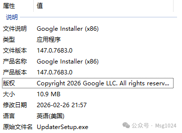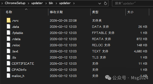 我通过7-Zip对`Chrome Setup.exe`执行了解压操作,得到了如下所示的一系列文件。.rsrc是Windows可执行文件的“资源段”(Resource Section),里面存放着在线安装器自身运行所需的一些“小资源”,比如安装器的图标、界面文字,以及下载逻辑的配置信息等。可这里面并不包含Chrome的主程序文件。