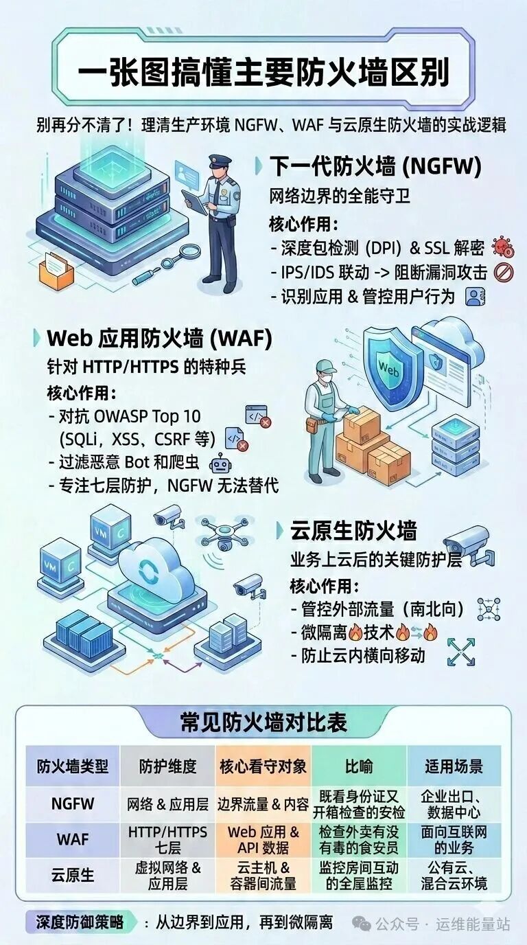摘要: 从网络边界到云端微隔离,带你理清 NGFW、WAF 与云原生防火墙的实战逻辑。