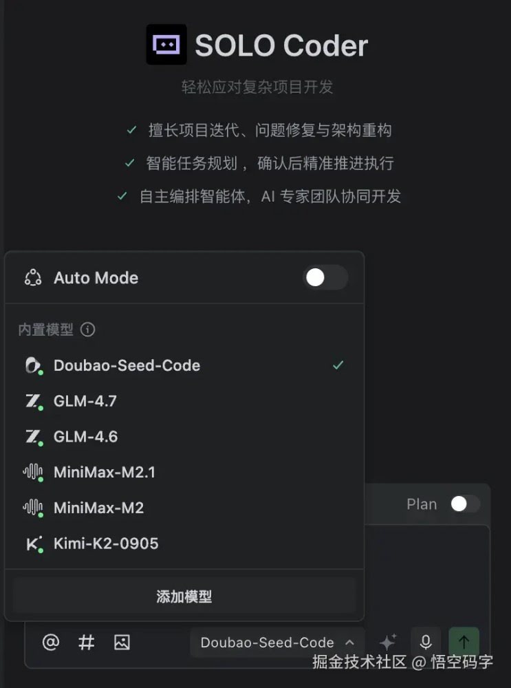 内置模型包括:Doubao-Seed-Code、GLM-4.7、GLM-4.6、MiniMax-M2.1、MiniMax-M2、Kimi-K2-0905。