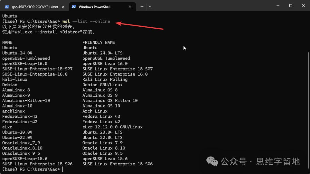 输入wsl --list --online指令,查看可以安装的操作系统。