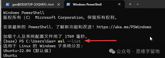 输入wsl --list查看已安装的linux系统。