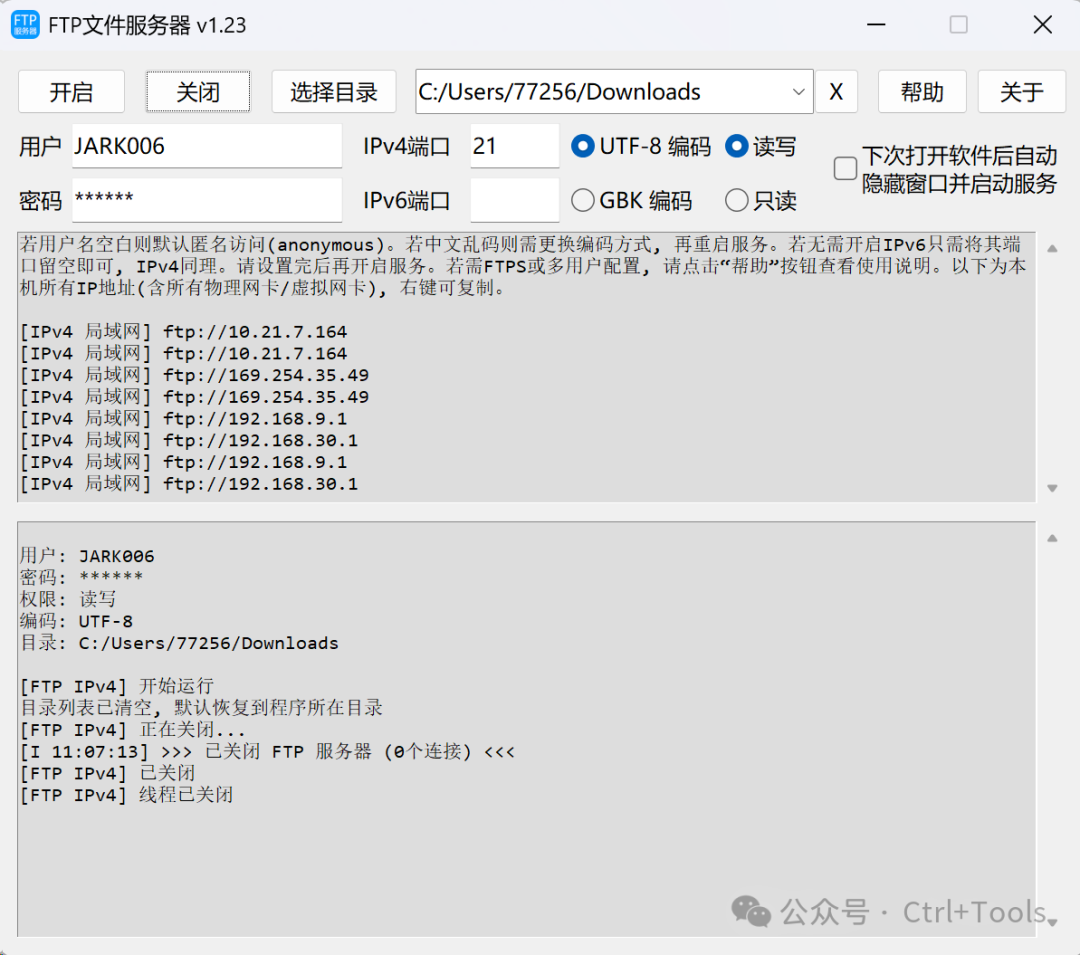 前言FTP文件传输神器,一键启动! 工具介绍:FtpServer今天推荐的实用工具——FtpServer,一键启动FTP服务,开启文件传输,支持多人传输,可配置账号密码、权限和分享文件路径。 网站链接:https://github.com/jark006/FtpServer 工具展示1.基本使用工具下载后双击运行 一键开启FTP
