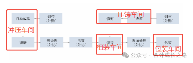 根据组织架构来设置部门:总经办、人事部、财务部、销售部、采购部、质量部、技术部、研发部、仓储部、生产部、各生产部门(根据工序、是否委外、是否需要入库,工期长短、物理位置等因素确定)。例如以下工序分成本中心(工序数据来自保隆汽车股票招股说明书):外购件经过自动线产线组装产品,设置一个传感器车间即可。3、成本中心根据属性(辅助生产、基本生产)关联部门。比较常用的有工时分配(机器工时、人工实际工时、标准工时)、定额分配、完工入库数分配;根据公司特征选用。- 机器工时:自动化高、设备贵、折旧多,费用主要跟机器有关。