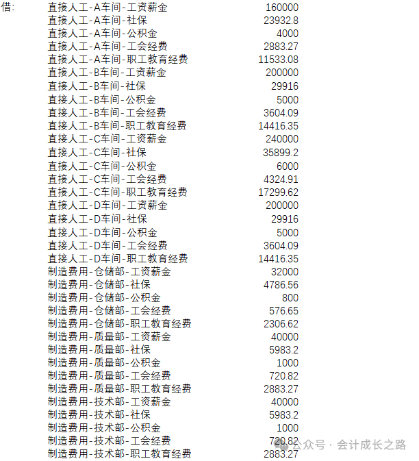 贷:银行存款-**银行(直接支付)/应付账款(从采购商过账)/其他应付款(员工报销)5、当月相关凭证完成后,达到成本核算条件并开始成本核算时结转直接人工到生产成本-直接人工 生产成本-直接人工-B车间贷:直接人工-A车间-工资薪金/社保/公积金/工会经费/职工教育经费/福利费等 直接人工-B车间-工资薪金/社保/公积金/工会经费/职工教育经费/福利费等 直接人工-C车间-工资薪金/社保/公积金/工会经费/职工教育经费/福利费等 直接人工-D车间-工资薪金/社保/公积金/工会经费/职工教育经费/福利费等2、科目余额表“生产成本-直接人工”本期发生额合计数与费用归集中直接人工金额一致,代表分配完成。3、以标准工时分配标准为例(从成本中心分配到产品)由于期末各工单生产进度不一致,很难预估约当系数,约当产量对生产管理的水平要求较高,一般企业不适用这种方式。故此例在产品不分摊直接人工,由完工产品全额承担。此示例仅作为直接人工分摊逻辑展示,使用ERP的企业,只要成本模块上线时基础设置好,在第2步费用引入核对正确,成本计算完,系统会自动分配。以下数据非真实。直接人工分配率=直接人工(取自科目余额表"生产成本-直接人工"本期发生额)/各车间总工时如果企业管理较好,适用约当产量法在完工成品和在产品之间分摊直接人工和制造费用,需要设置约当系数和在产品分配标准设置。