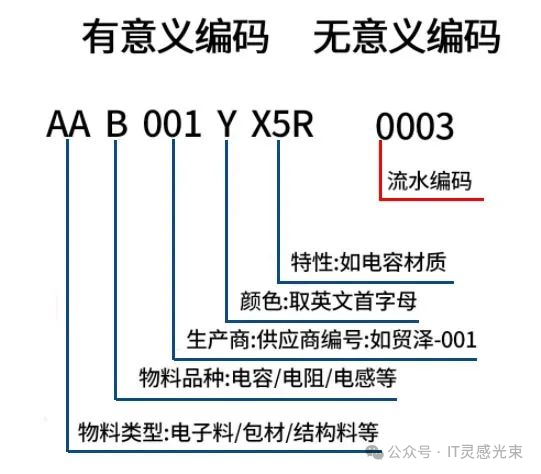 三、物料编码的三种设计逻辑 市面上的编码方案五花八门,但归根结底只有三种底层逻辑: 智能编码(有含义编码)每一段编码都有具体含义,拆开来就能读懂这是什么料。比如"RM-AL-6061-T6-20×20-001",一眼就知道是铝合金6061-T6、截面20×20的原材料。 优点是可读性强,不用查系统就能大致判断物料属性,老员工用起来很顺手。缺点是编码会变得很长,而且一旦属性变化(比如改了规格),编码就得跟着改,牵一发而动全身。 更致命的问题是:属性分类做得越细,越容易出现边界模糊的情况,到底该归哪一类,争论不休。 无智能编码(纯流水号)完全不赋予含义,就是"00001、00002、00003……"一路排下去。所有物料的属性,靠系统里的物料主数据来记录和查询。 优点是简洁、扩展性极强、不存在分类争议。缺点是脱离系统什么都看不出来,对系统依赖度高,人工操作场景下容易出错。 混合编码(大类前缀+流水号)前几位是大类标识,后面接流水号。比如"RM-00234",知道这是原材料(RM),具体是什么,查系统。 这是目前绝大多数制造企业的主流选择,兼顾了可读性和扩展性。大类前缀让人一眼能判断物料的基本归属,流水号保证了唯一性和扩展的灵活度。对于大多数企业,这个方案是最务实的起点。