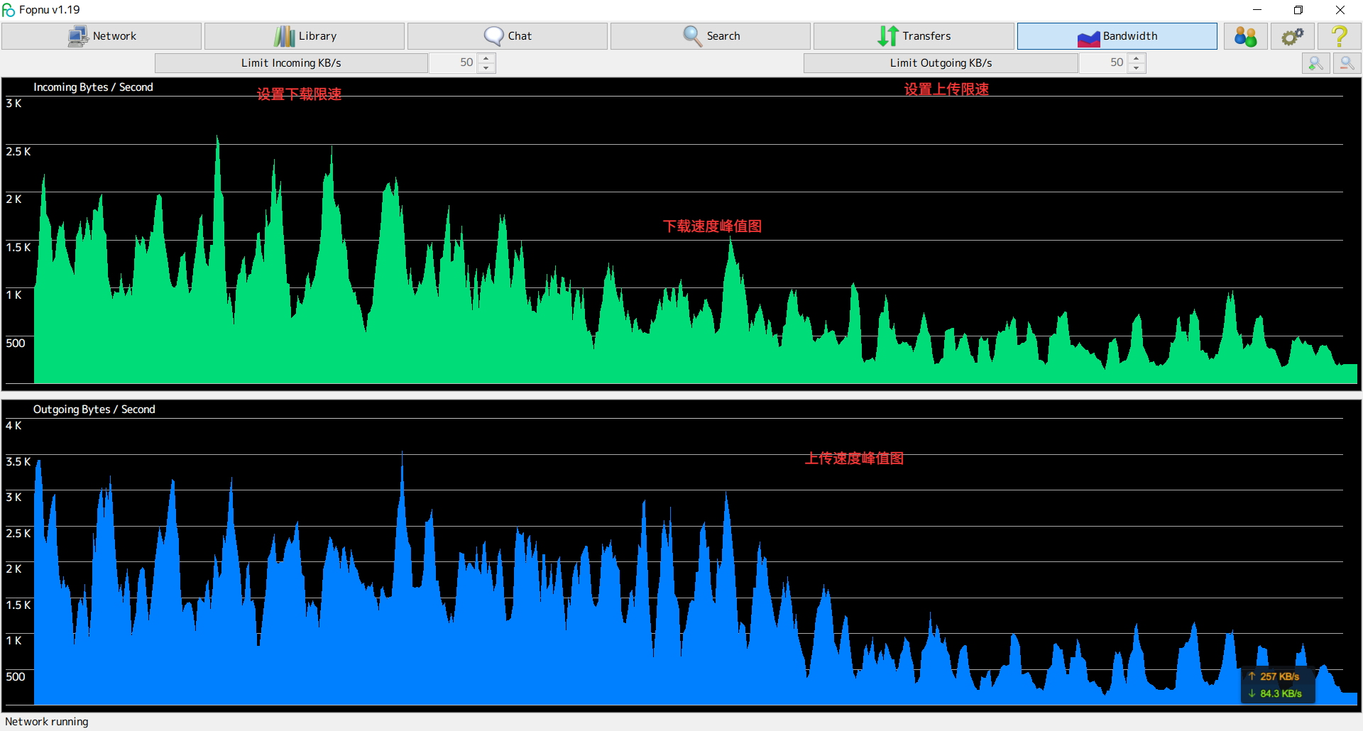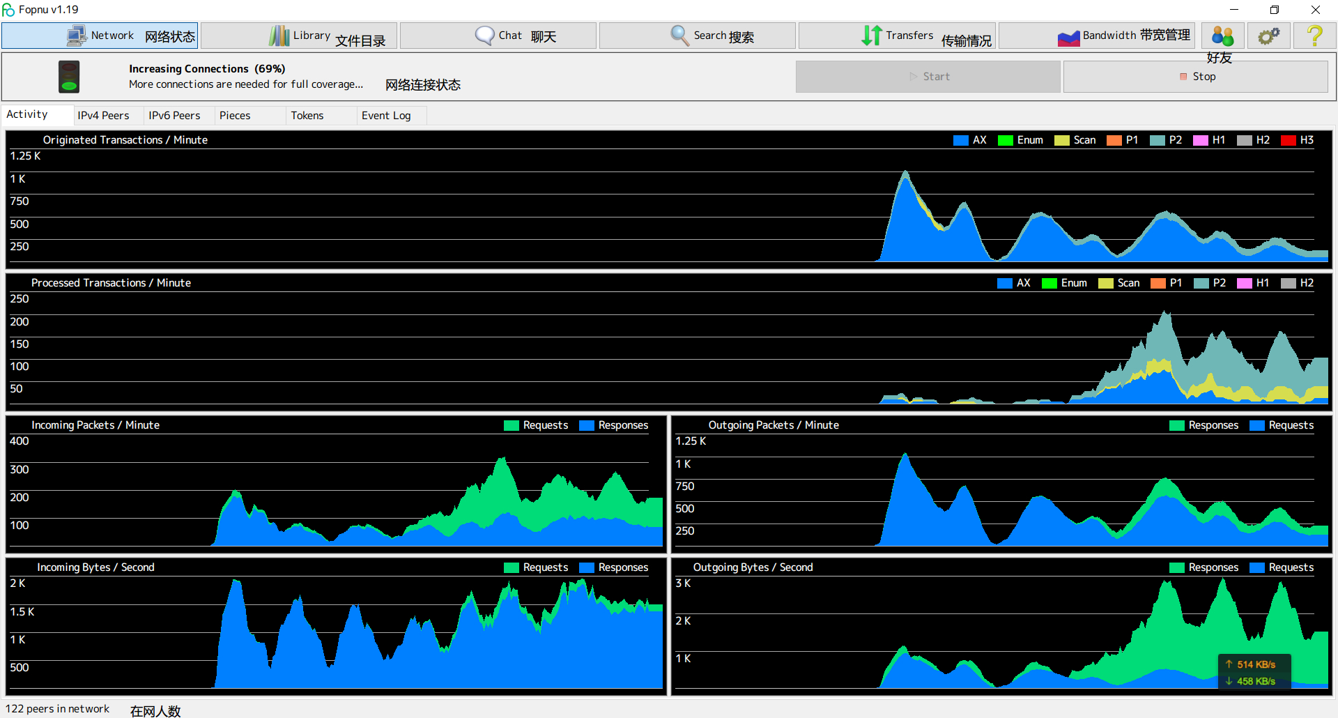 初次运行时需要配置你的下载目录、文件共享目录、限速、带宽情况。以后每一次启动大概就是这个界面,每一次启动,fopnu都会先探测在网节点是否可以连接,只有可连接节点数量达到一定程度后,才可以开始接下来的使用。