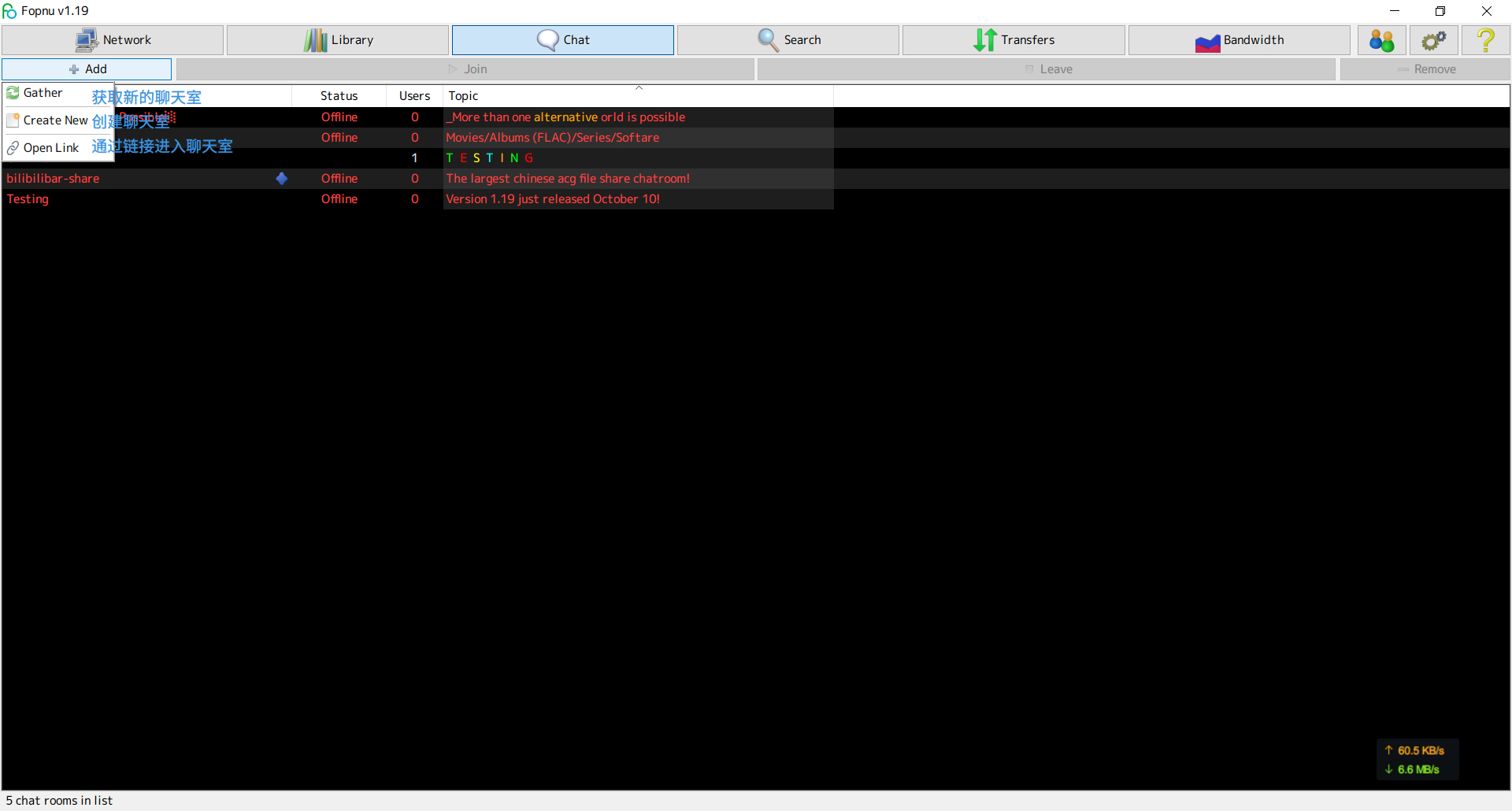 序言:本指南仅在于使用fopnu进行共享(P2P)网络测试和学习目的,软件本身不存储任何数据。fopnu是由 winmx 团队,继 winmx 2007年停止开发后,于近期重启并重写架构的一款P2P文件共享软件,目前软件闭源。它吸取了电驴的文件长效与BT的高速,具有文件共享、好友、群聊等功能,软件极其轻量,是当下迅雷的替代品之一。