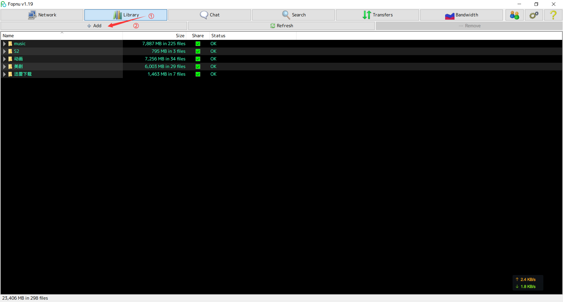 话粗理不粗,人们已经被迅雷的无脑下载惯坏了,那种几十年前开着电驴给人上传,碰到有人给你供源你能高兴的跳半天的时代一去不复返,也许老资源我们没办法重新做种,但是新资源永远在不断地涌现,何不如从现在抓起,将每一个自己收到的好资源赠予大众,而不是在那里感叹“时代变了!”更不是用来牟利!放弃迅雷,从自身做起,从fopnu开始!废话少说,来看看如何添加自己要共享的文件目录。