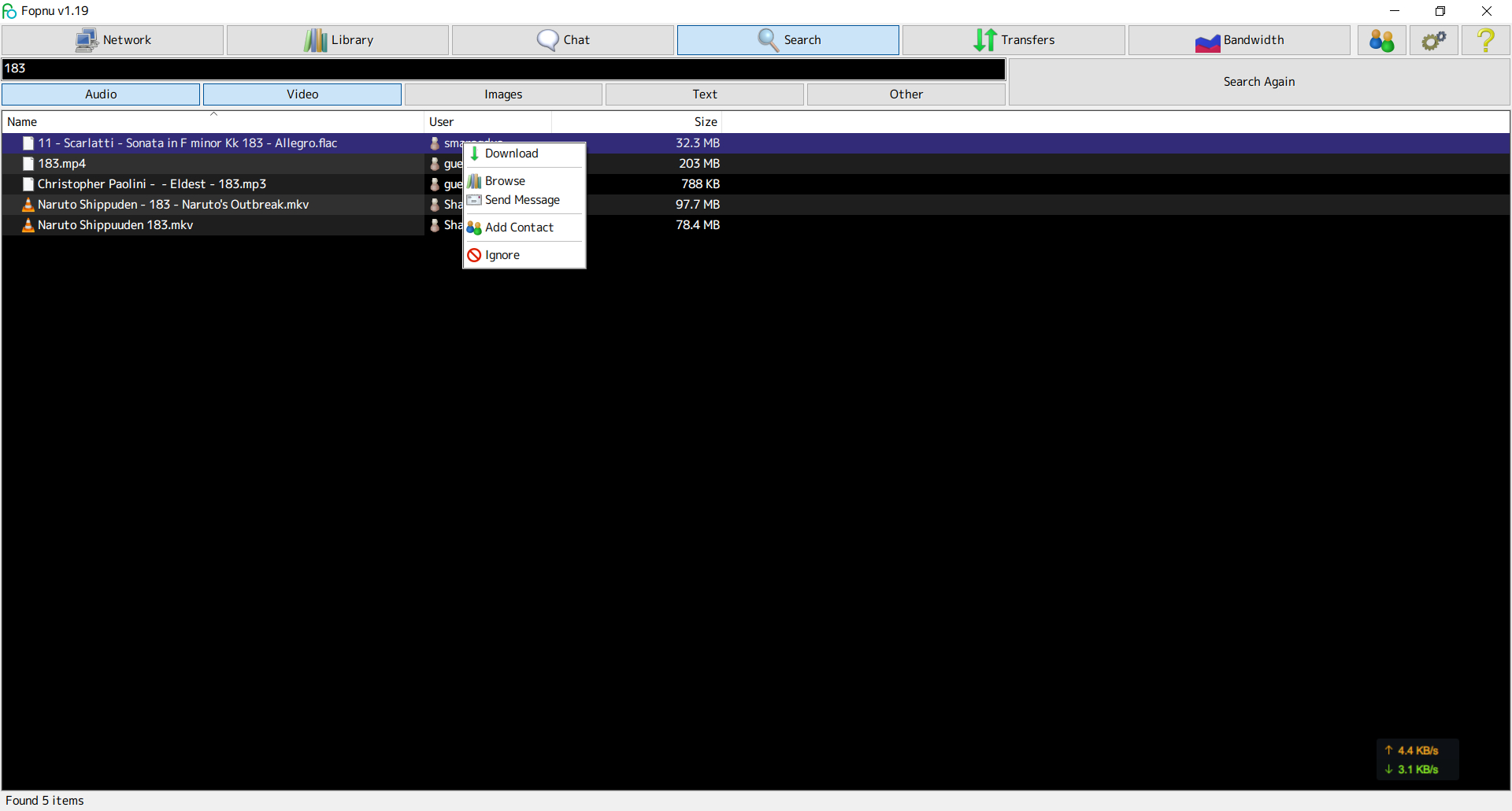 先来说说好友系统,fopnu支持通过在搜索文件过程和下载文件过程中添加好友,或者通过链接添加好友。只需右击用户,选择“Add contact”即可。